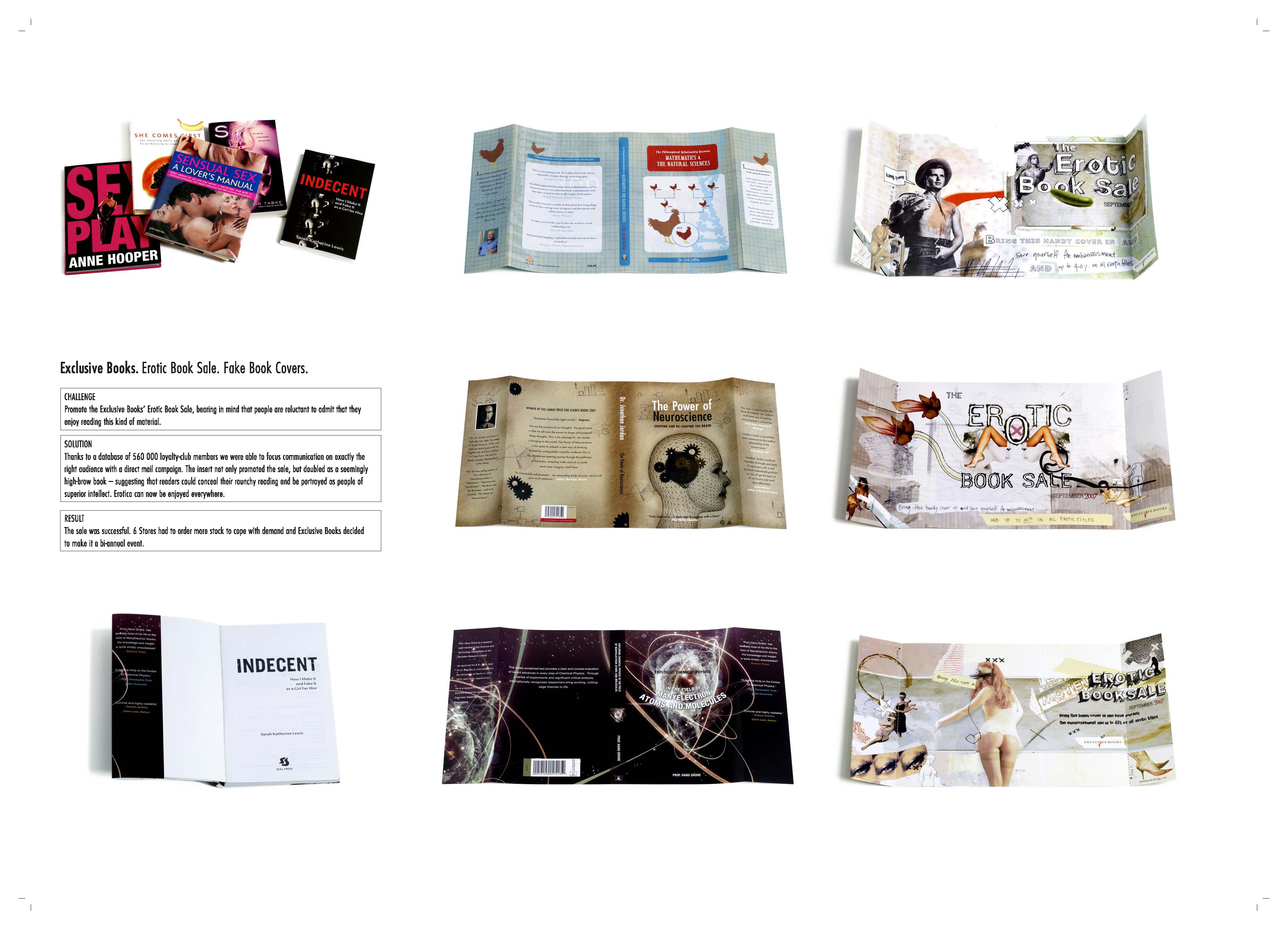 This direct mail piece was developed to promote the annual erotic book sale at Exclusive books. The insert doubled as a seemingly high-brow book to conceal the reader’s raunchy reading material, thereby reducing embarrassment while ‘stimulating’ sales.