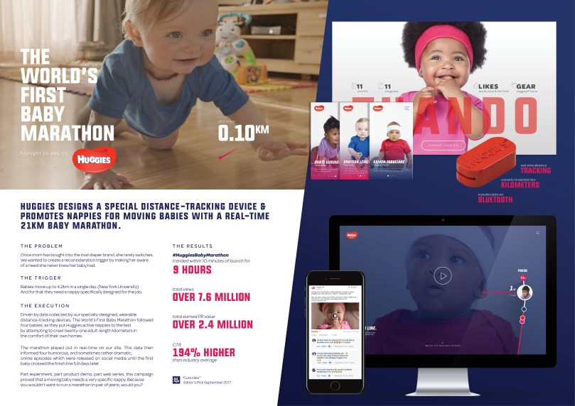 Babies move way more than their parents realise – over 3km*(New York University) in a single day. In order to truly put the comfort and fit of Huggies® diapers to the test, and simultaneously prove just how much babies actually move, our babies were fitted with distance-tracking ‘Thingiemabobs’ and given an audacious goal: 21 adult-length kilometers.