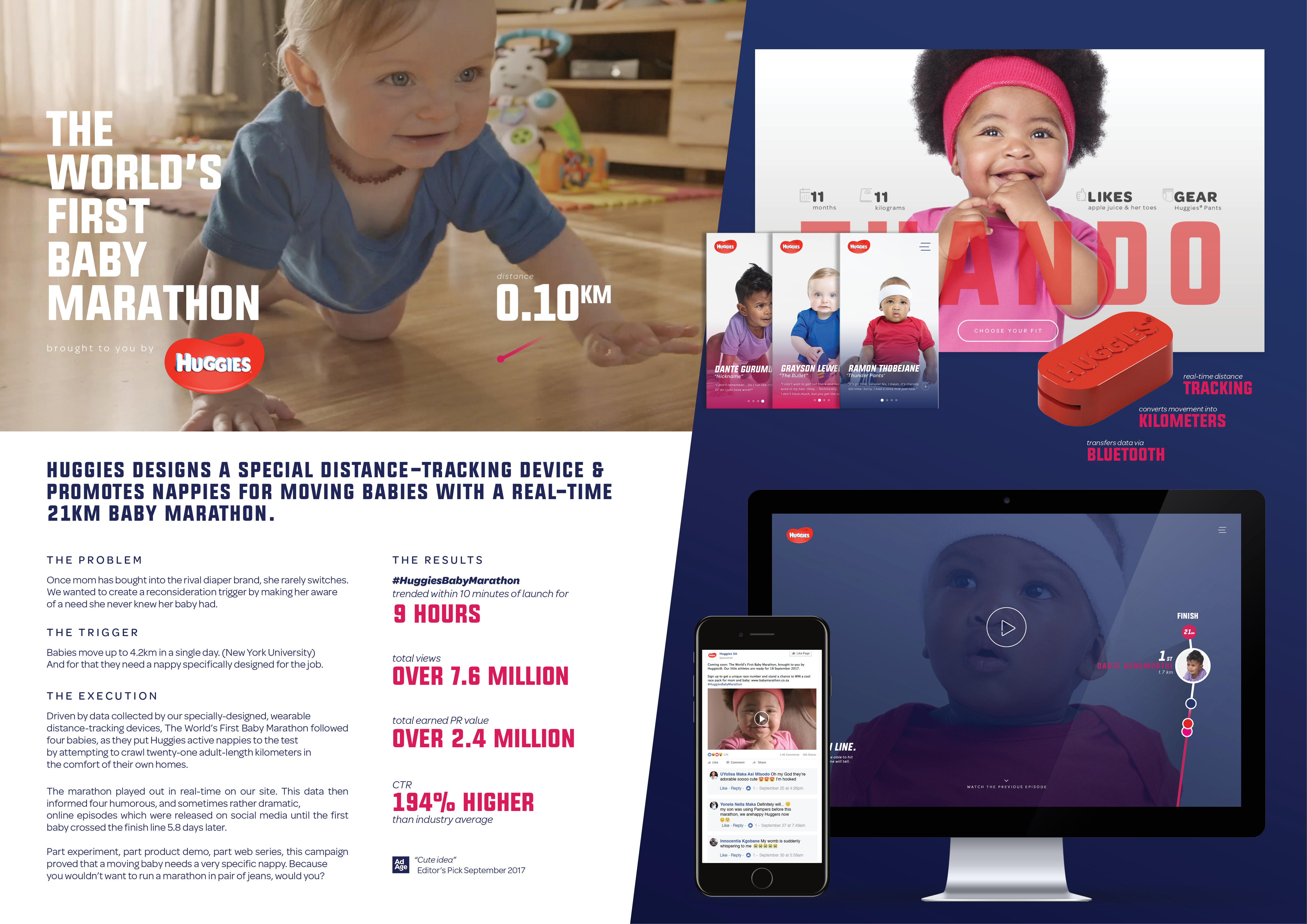 Babies move way more than their parents realise – over 3km*(New York University) in a single day. In order to truly put the comfort and fit of Huggies® diapers to the test, and simultaneously prove just how much babies actually move, our babies were fitted with distance-tracking ‘Thingiemabobs’ and given an audacious goal: 21 adult-length kilometers.